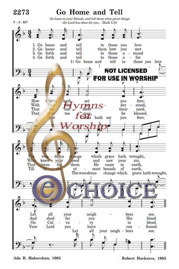 Go home and tell to those you love  How Christ hath set you free The wondrous change which grace hath wrought, Let all your neighbors see.