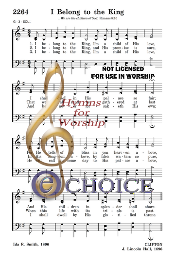 I belong to the King, and His promise is sure, That we all shall be gathered at last In His kingdom above, by life’s waters so pure, When this life with its trials is past.