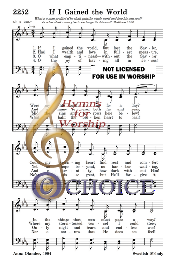 If I gained the world, but lost the Savior, Were my life worth living for a day? Could my yearning heart find rest and comfort In the things that soon must pass away? If I gained the world, but had no Savior, Would my gain be worth the life-long strife? Are all earthly pleasures worth comparing For a moment with a Christ-filled life?