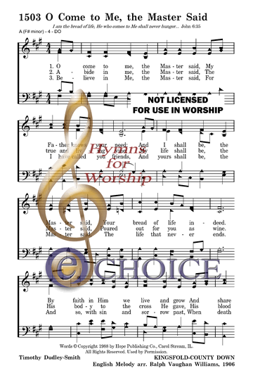 Verse 1: 1. O come to me, the Master said, My Father knows your need; And I shall be, the Master said, Your bread of life indeed. By faith in Him we live and grow And share the broken bread, And all His love and goodness know, For so the Master said. 2. Abide in me, the Master said, The true and living vine; My life shall be, the Master said, Poured out for you as wine. His body to the cross He gave, His blood He freely shed, Who came in love to seek and save, For so the Master said. 3. Believe in Me, the Master said, For I have called you friends, And yours shall be, the Master said, The life that never ends. And so, with sin and sorrow past, When death itself is dead, The Lord shall raise us up at last, For so the Master said. 4. NC9013 5. NC9013 O come to me, the Master said, My Father knows your need; And I shall be, the Master said, Your bread of life indeed. By faith in Him we live and grow And share the broken bread, And all His love and goodness know, For so the Master said.