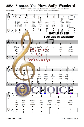 Sinners, you have sadly wandered Where destruction’s billows roll, And your bark is surely sinking In the depths beyond control.