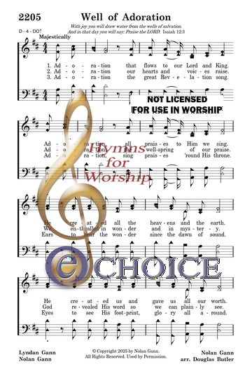 Adoration that flows to our Lord and King. Adoration, all praises to Him we sing. He created all the heavens and the earth. He created us and gave us all our worth. God reveals His majesty, a fingerprint. We cannot go any place He has not been. Buoyed by His blessings, we lift up adoration.