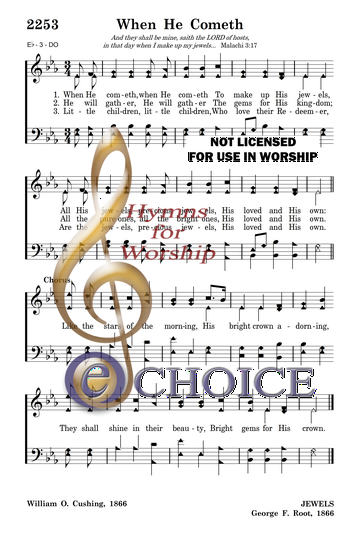 When He cometh, when He cometh To make up His jewels, All His jewels, precious jewels, His loved and His own: